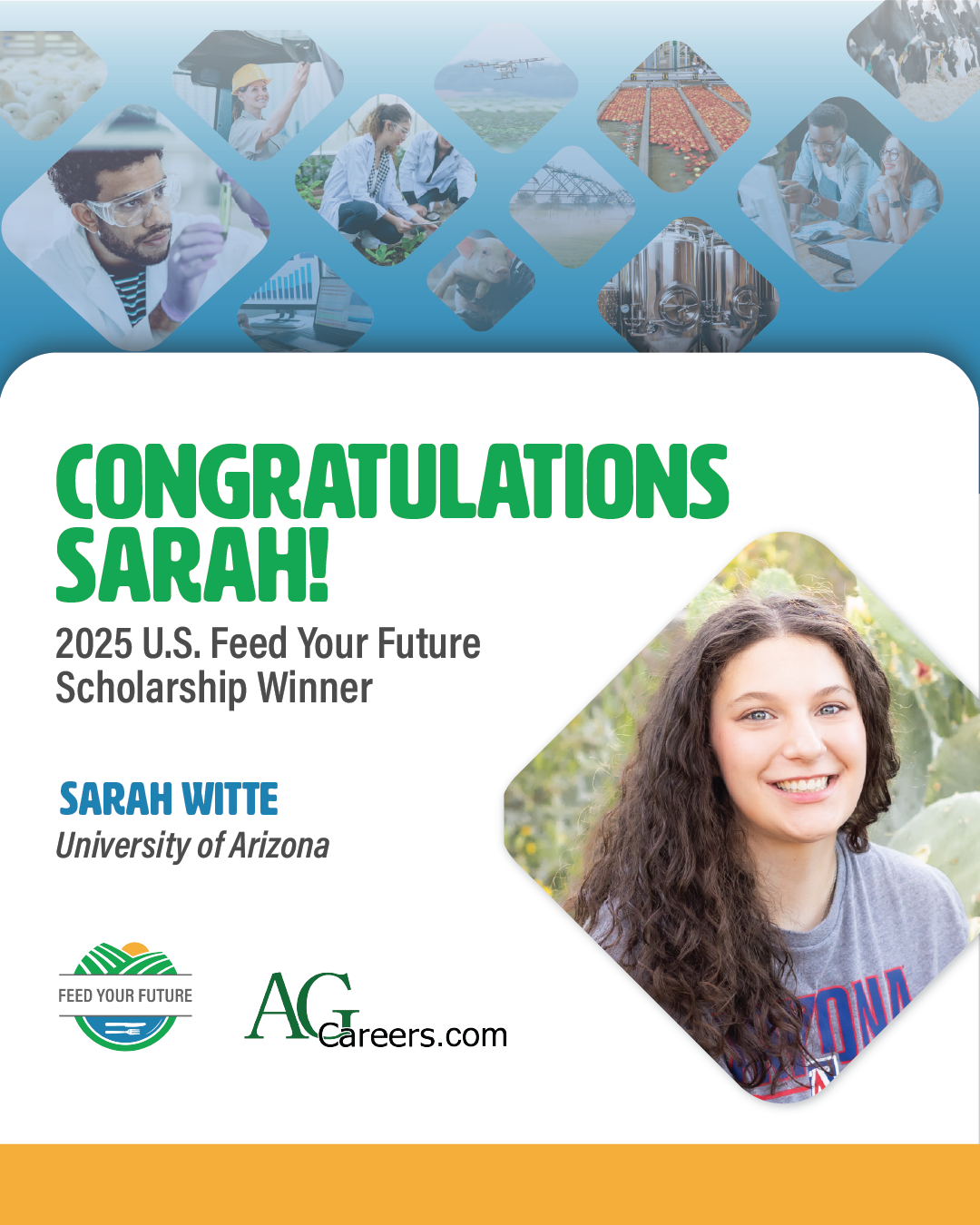 AgCareers has awarded the fourth annual USA Feed Your Future Scholarship to Sarah Witte, a student studying at the University of Arizona. Witte is studying Systems Engineering and minoring in Food Science, Fermentation, and Biosystems Engineering.